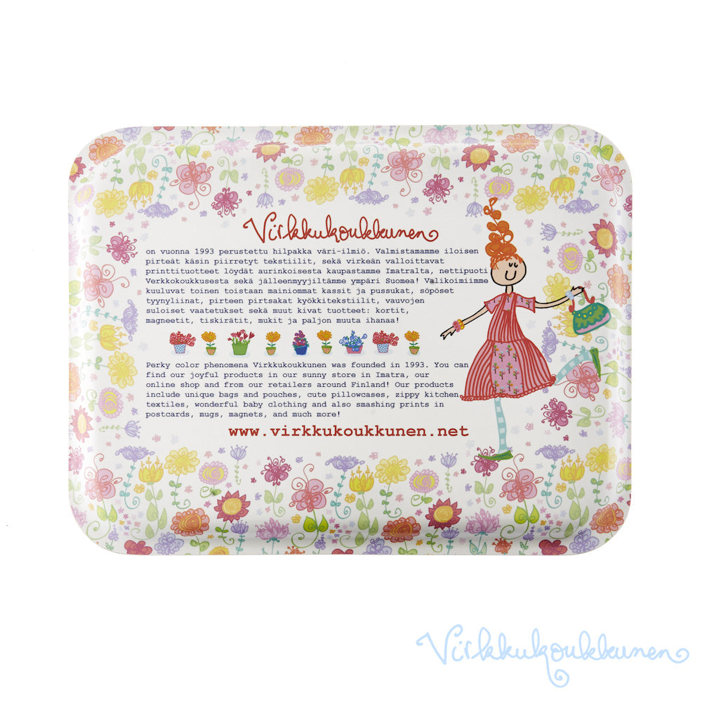 Tarjottimen taustapuoli on myös huolellisesti kuvitettu ja sisältää tietoa VirQ:sta sekä suomeksi että englanniksi. Näin tarjotin on kaunis joka kulmasta katsottuna ja kertoo tarinaa suomalaisesta designista.