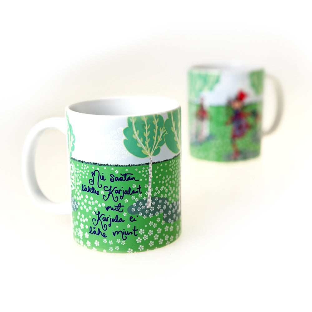 Tässä mukissa on teksti "Mie saatan lähtee Karjalast mut Karjala ei lähe miust!"