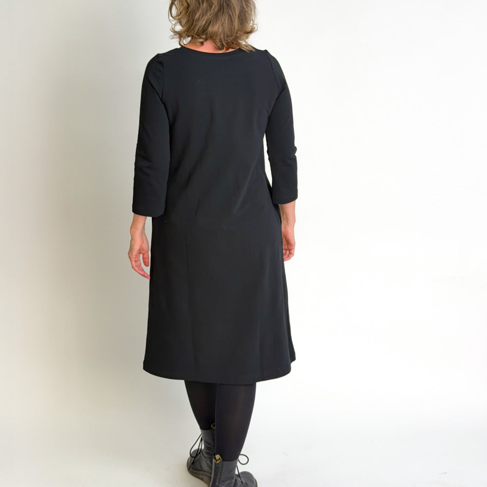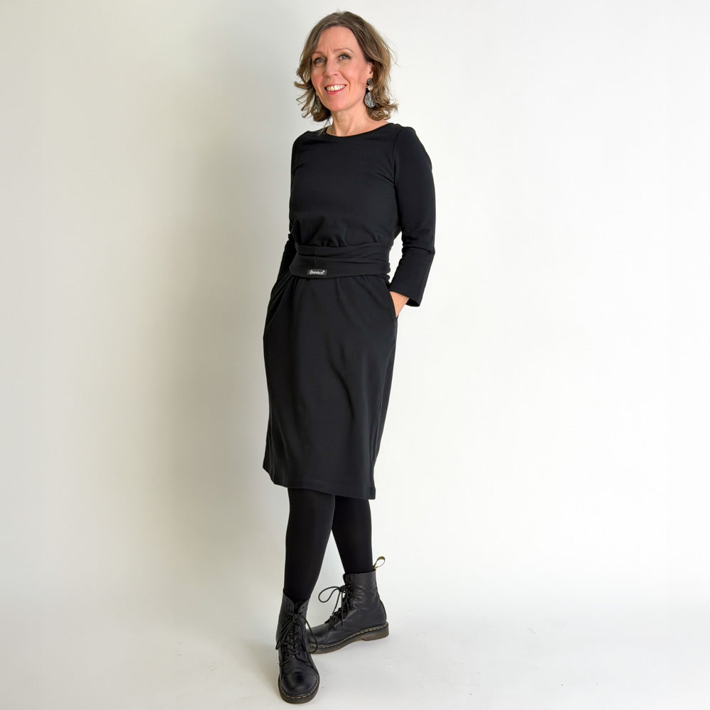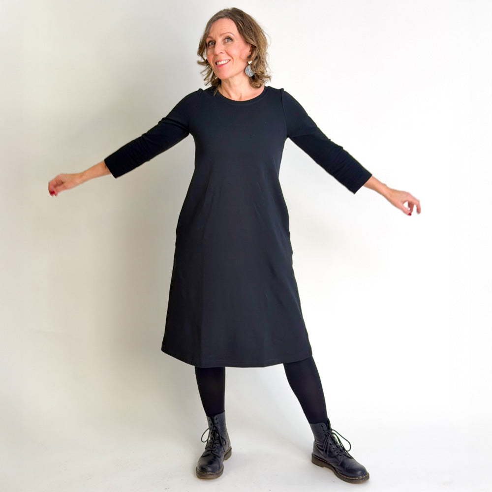Pääntien joustava rakenne antaa tilaa olematta liian suuri. Pukeva 4/5-hiha jää kauniiseen kapeaan kohtaan käsivartta – se ei ole täyspitkä, vaan antaa tilaa esimerkiksi rannekoruille ja kelloille. 4/5-hiha on pidempi kuin esimerkiksi Kelpokolttu- tai Kiva-mekoissamme. Käytännölliset sivusaumataskut tekevät mekosta entistä toimivamman.