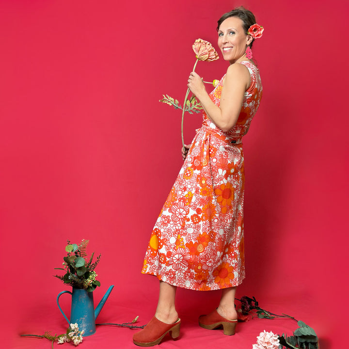 Valloittava hihaton maximekko on laadukasta ja mukavan tuntuista trikootamme ja se on ommeltu Suomessa. Mekossa on tietenkin taskut!