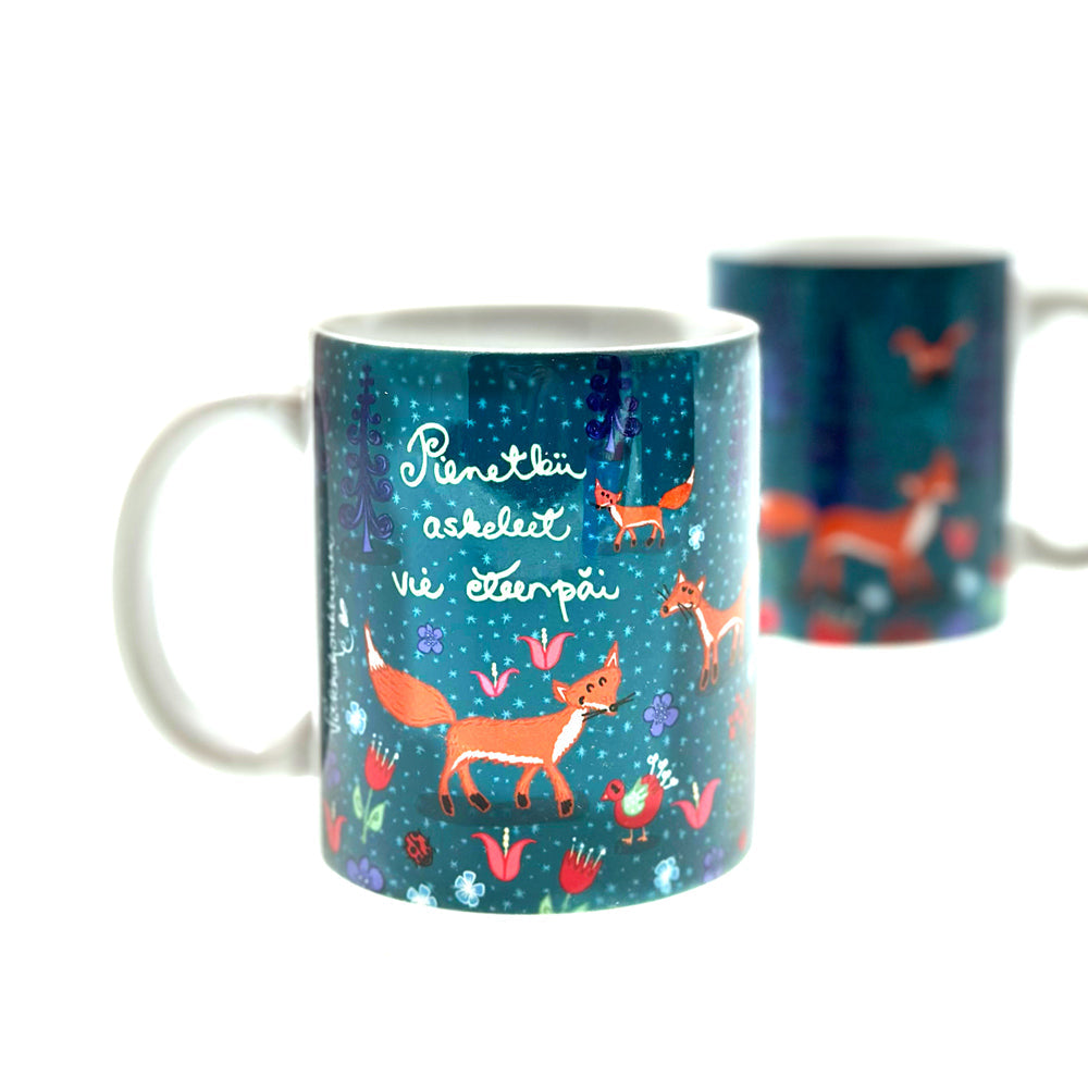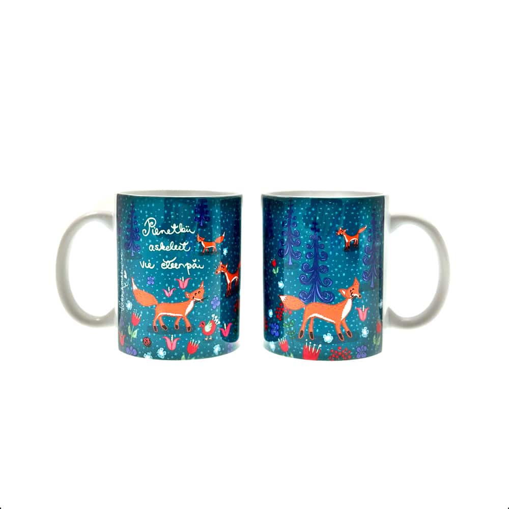 Tässä mukissa on teksti "Pienetkii askeleet vie eteenpäi"