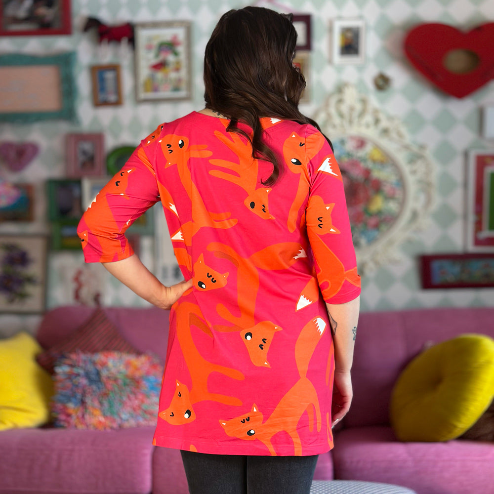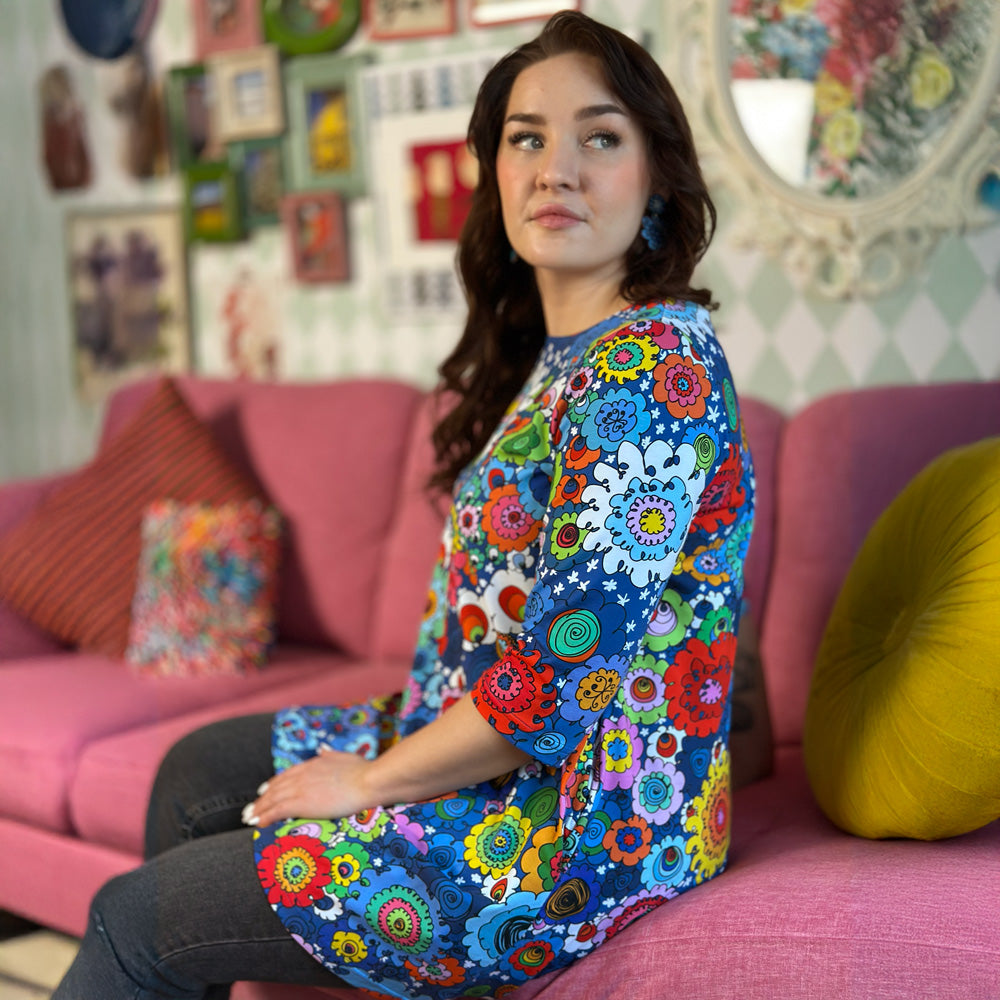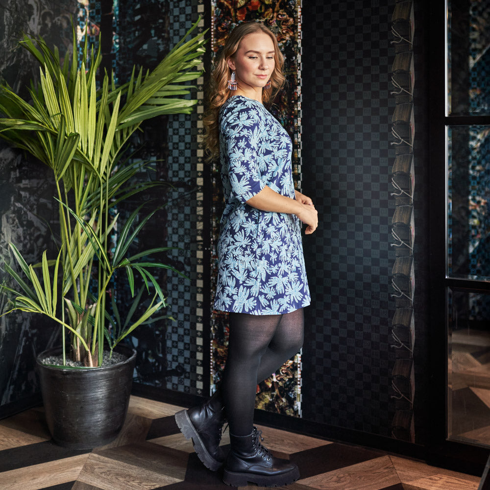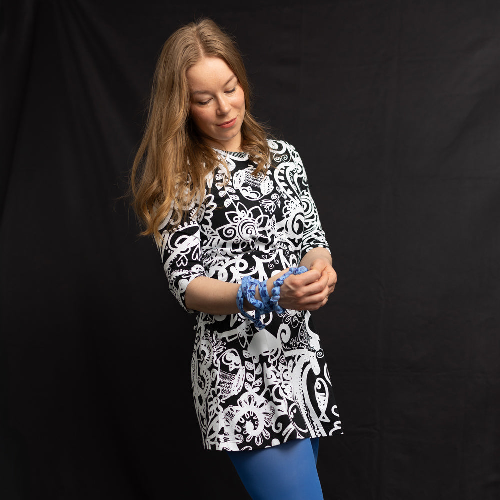 VirQ by Virkkukoukkusen ihanat, Suomessa suunnitellut ja valmistetut trikootunikat ovat mielettömän mukavia päällä ja helppohoitoisia pese ja pidä -vaatteita. Napakka, puuvillasta ja elastaanista valmistettu trikooneulos ei juurikaan rypisty, joten voit pukea tunikan päällesi ilman silittelyä – ihan älyttömän kätevää! Kaavoitus on mukavan väljää ja reilua, mikä tekee tunikoista sopivia monenlaisille ja -kokoisille vartaloille.