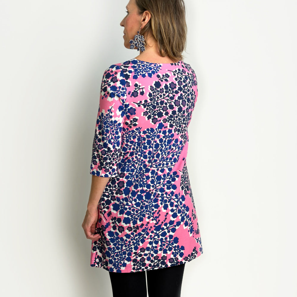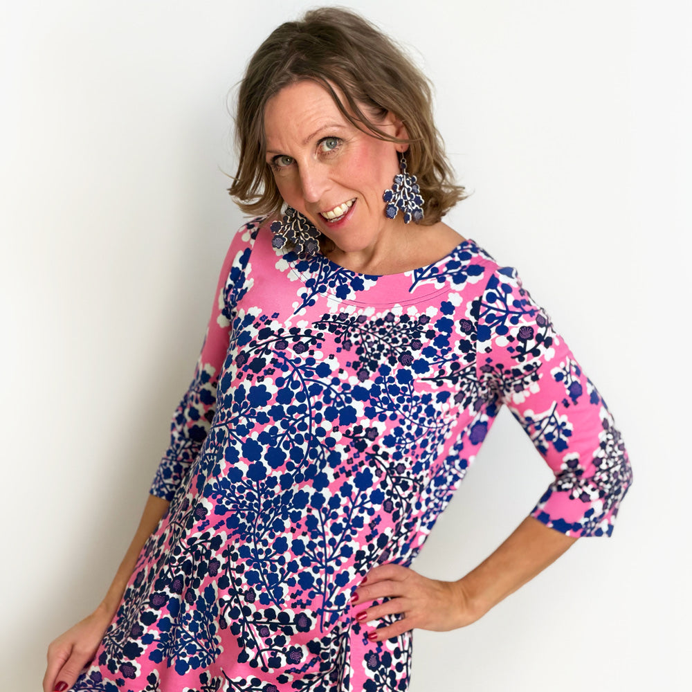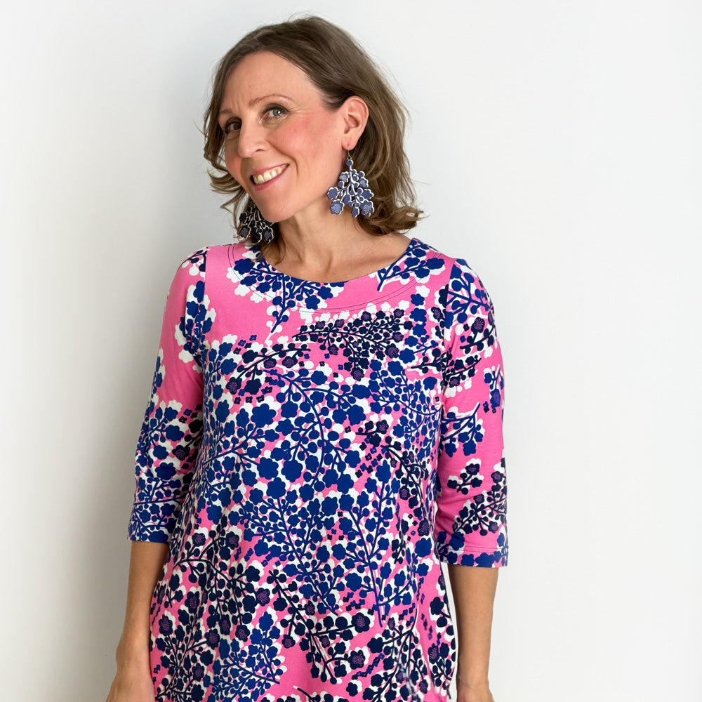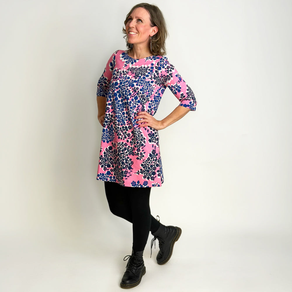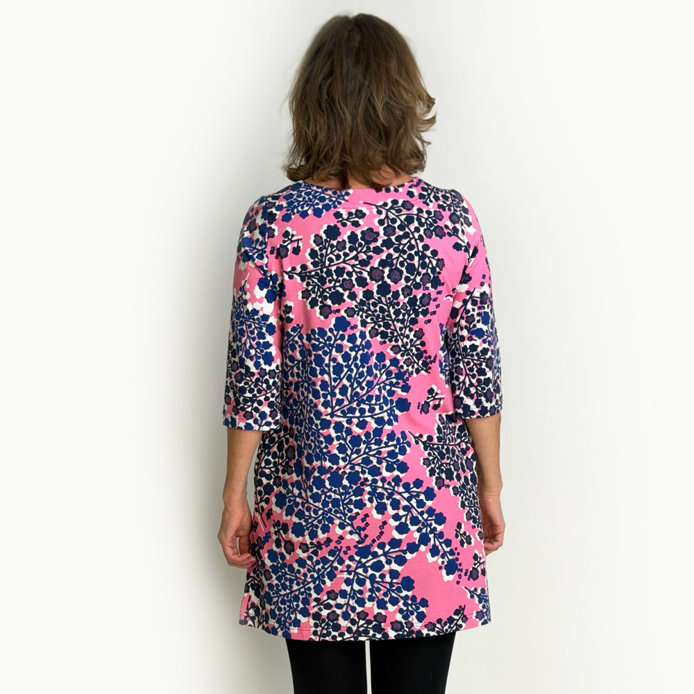 Kirsikkapuu-tunikassa kevät saapuu luoksesi kauniiden kirsikkapuun oksien muodossa, jotka hengähtävät lempeästi pinkkiä taustaa vasten. Tämä romanttinen kuosi tuo mukanaan kirsikkapuiden kukkaloiston tunnelman ja lupauksen uusista aluista.