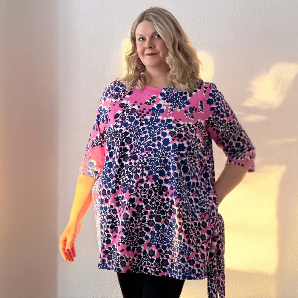 Tunikaan pehmeä vaaleanpunainen pohjaväri luo täydellisen kehyksen herkille oksille, tehden siitä monikäyttöisen ja helposti yhdisteltävän valinnan. Kirsikkapuu-tunika on kuin keväinen tuulahdus, joka tuo arkeen ripauksen runoutta ja luonnon herkkää kauneutta.
