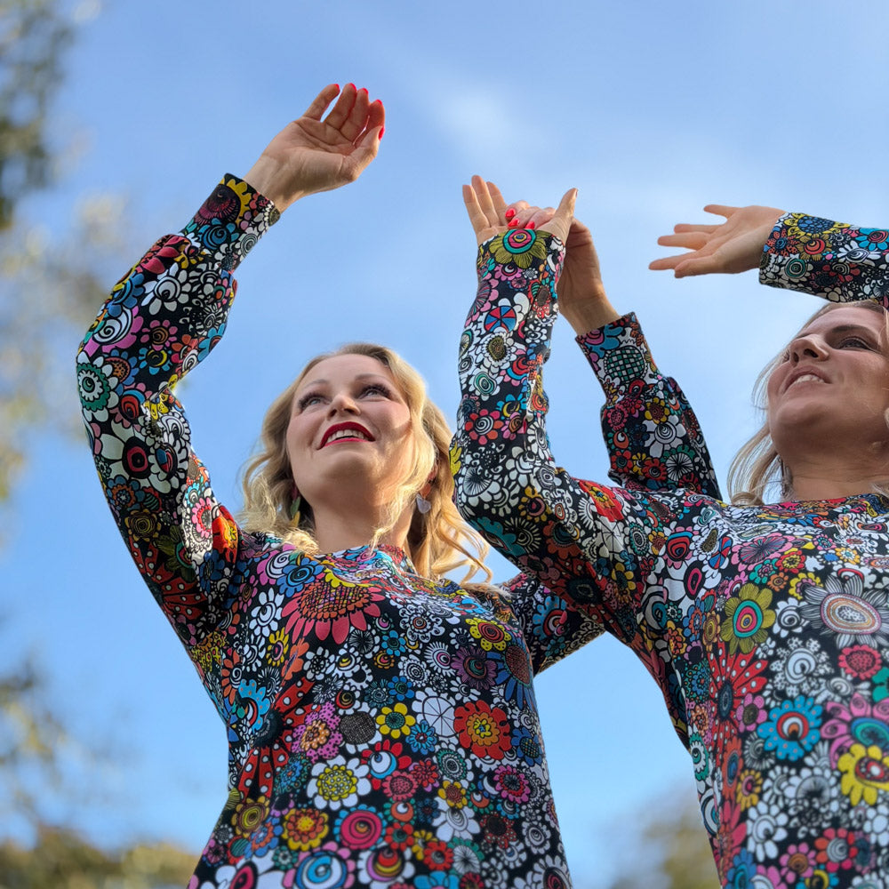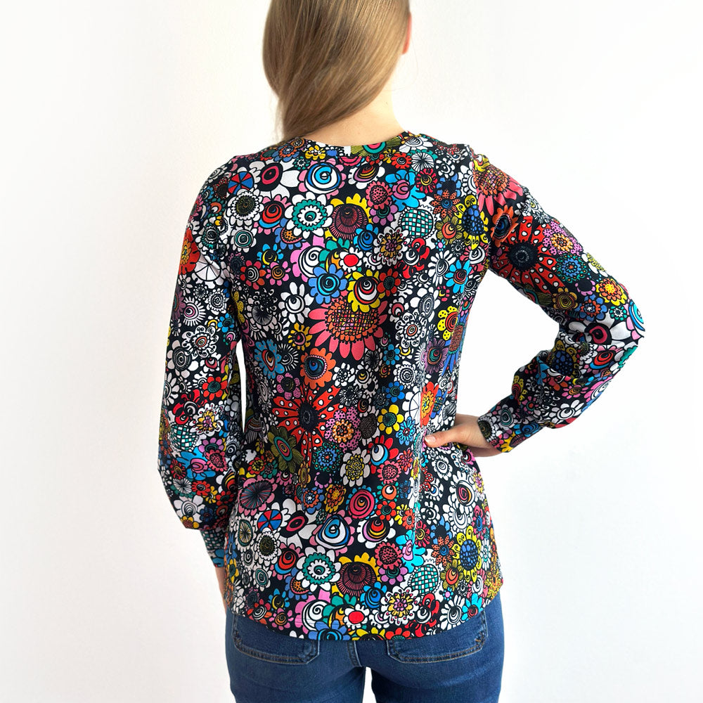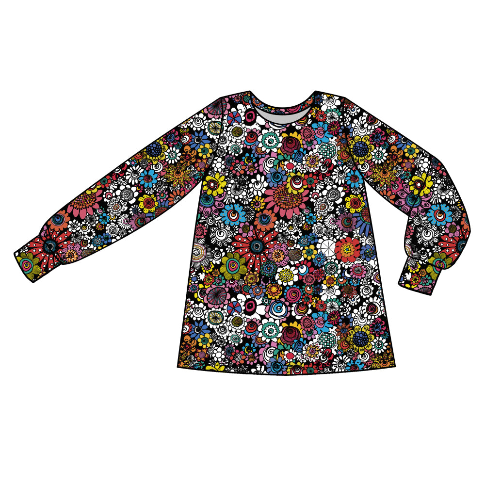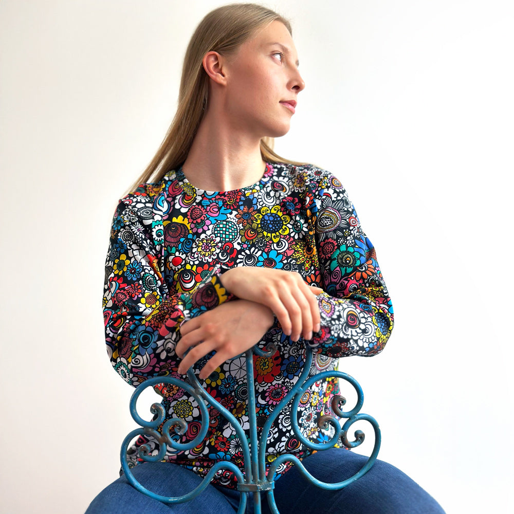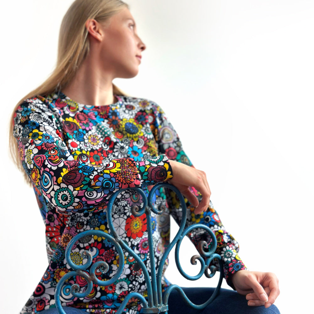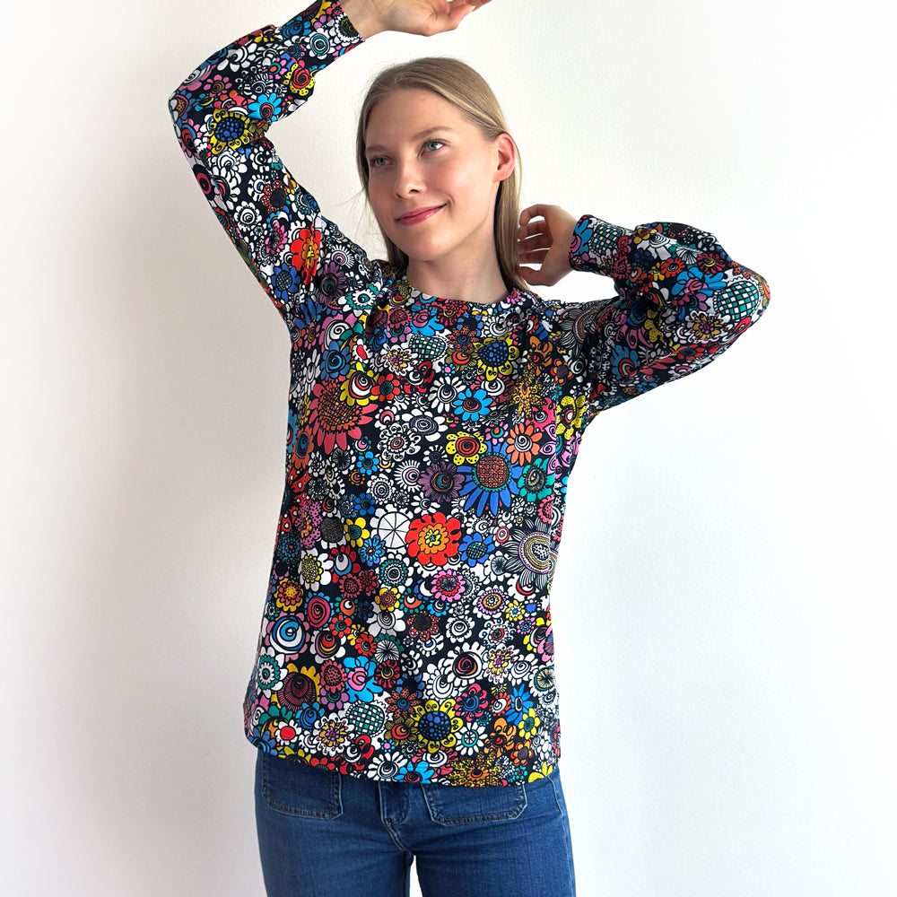 Tässä puserossa on rakastettu Megaminikukkaralla -kuosi. Kuosin kukat ovat huomiota herättäviä, tehden jokaisesta puserosta ikään kuin elävän kukkatarhan. Värikkäät kukat puhkeavat eloon tummaa taustaa vasten, kuin luoden oman universuminsa. Kuosi on ajaton ja elegantti - on helppo ymmärtää, miksi se on niin pidetty!