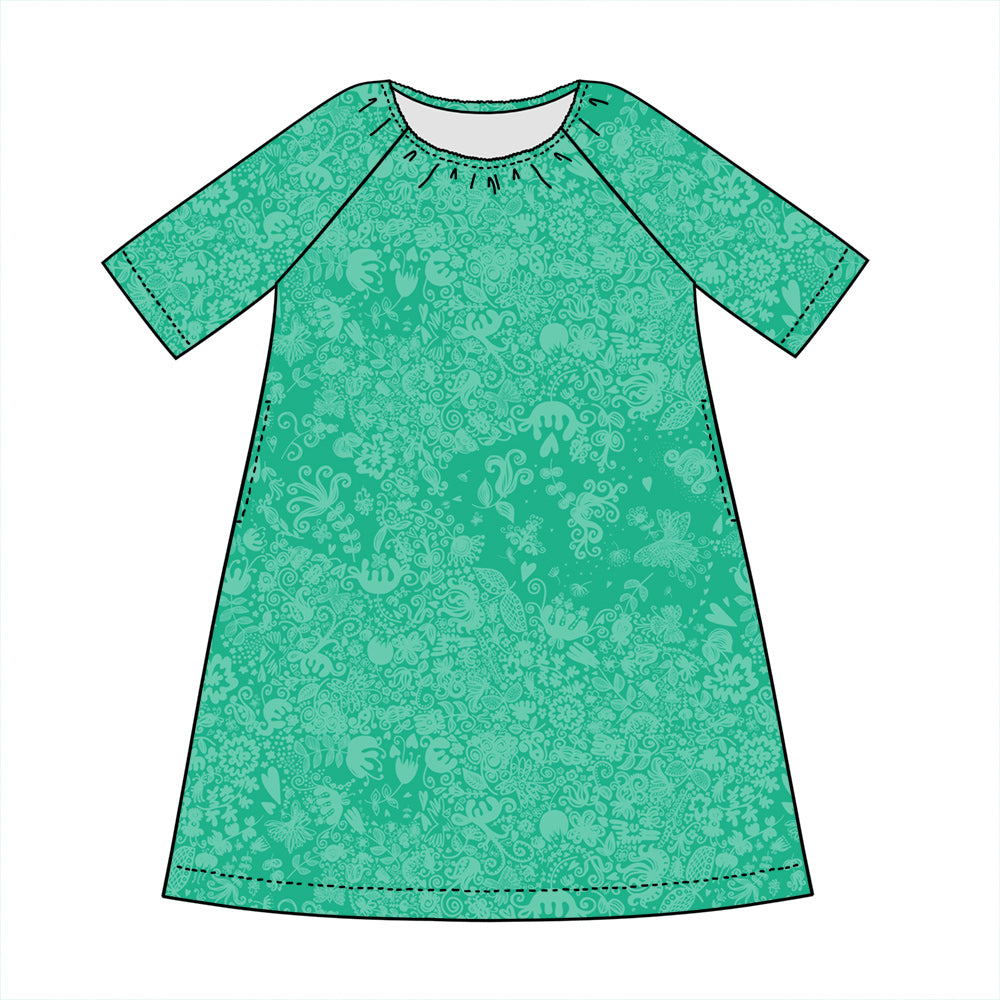 Huomioithan kokoa valitessa, että mekko on valmistettu venymättömästä puuvillapopliinista ja tarvitsee siksi eri tavalla liikkumavaraa ja väljyyttä kuin esimerkiksi joustava trikooneulos. Kangas on kevyt mutta napakka ja se laskeutuu kauniisti.