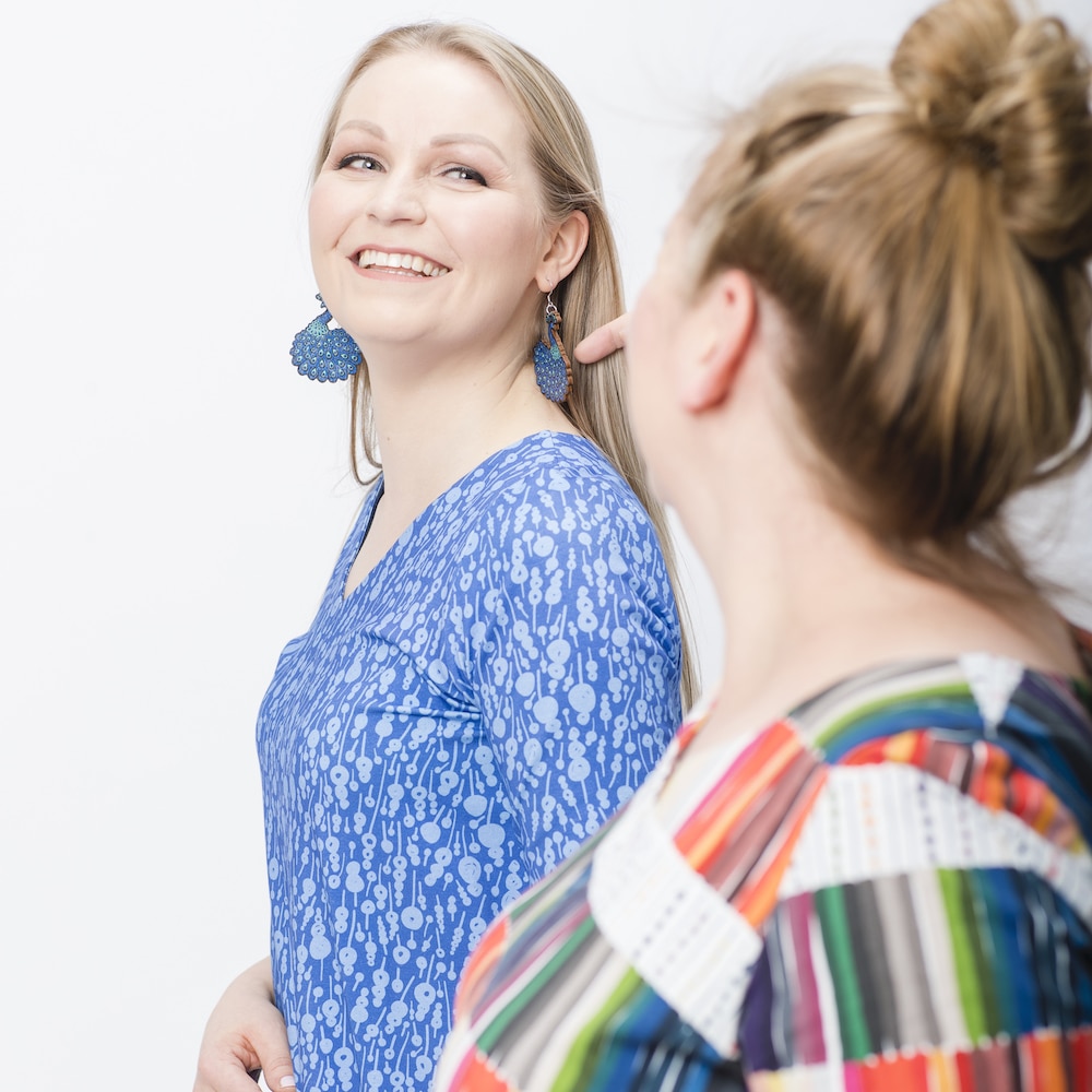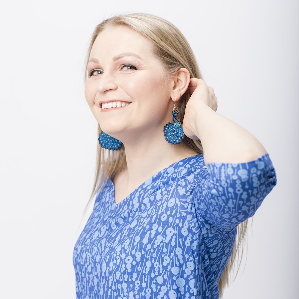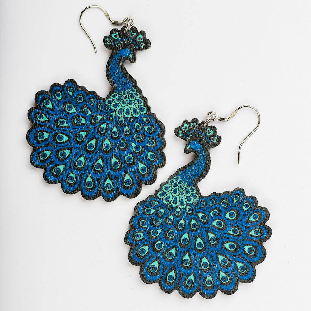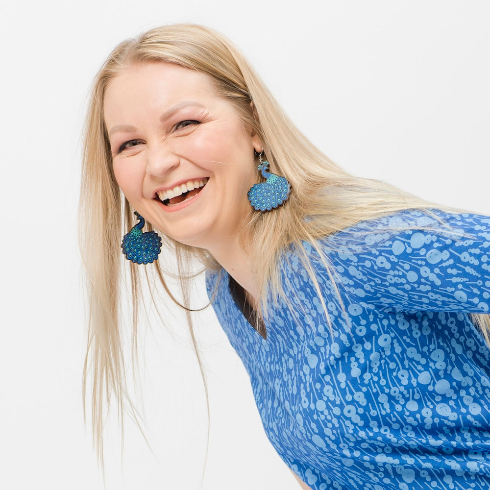 The elegant Riikinkukko (Peacock) pattern-inspired earrings capture attention in beautiful shades of blue and turquoise.